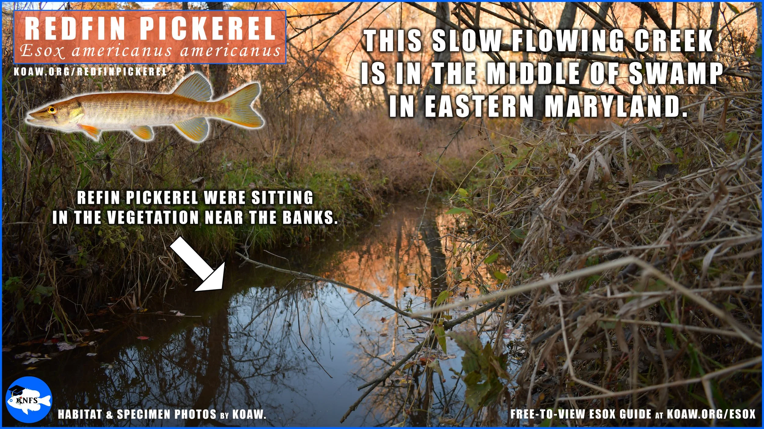 HABITAT: Redfin pickerel almost exclusively inhabit areas with dense vegetation and calm waters. Swamps, backwaters, and quiet streams are preferred. This species may also be found in ponds and lakes, and less so, in rivers within slow waters. This subspecies is known to tolerate a wide range of pH in waters from acidic to neutral to basic but typically is known to inhabit more acidic, stained waters. This species may, at times, be found in brackish waters.